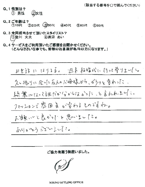 お世話になります。週末結婚式に行って参りました。久し振りに会った友人のお母様から、ガラッと変わった、綺麗になって誰だか分からなかった、と言われました。