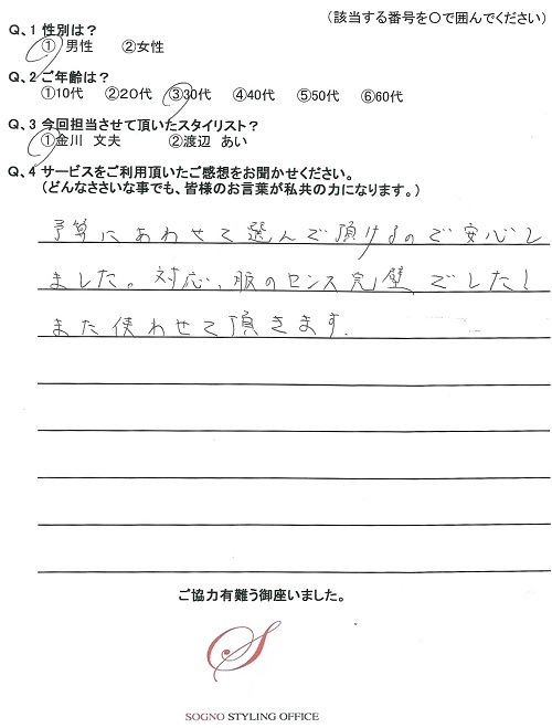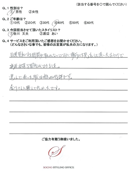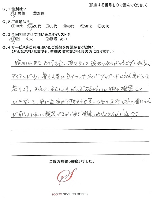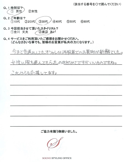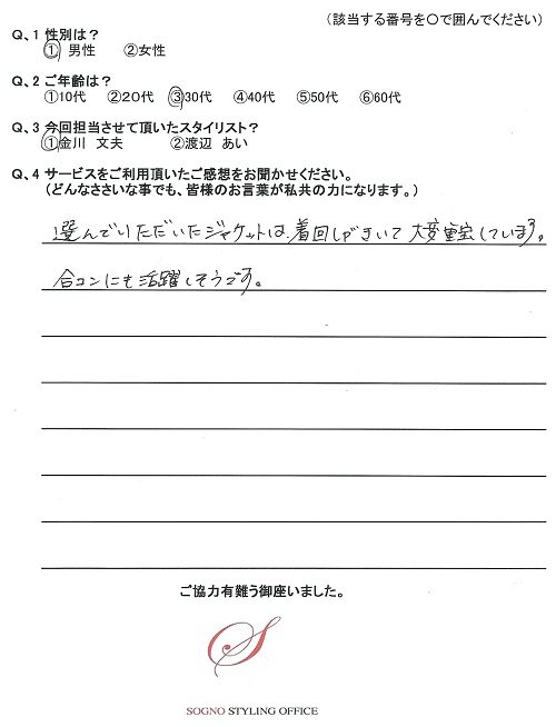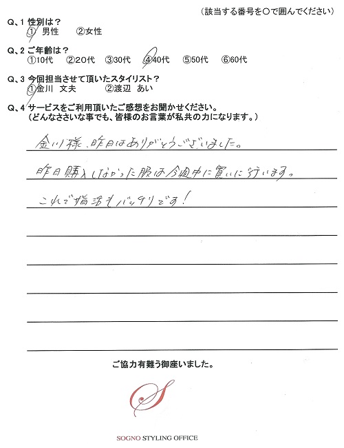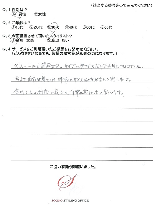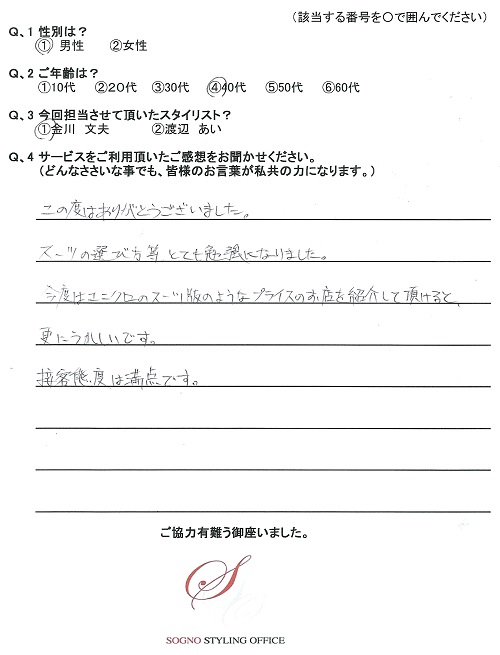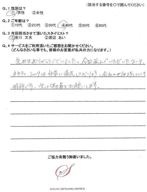先日はありがとうございました。今回選んでいただいたスーツ、ネクタイ、シャツは非常に満足しております。会社の女性スタッフにも好評です。次は休日着をお願いします。