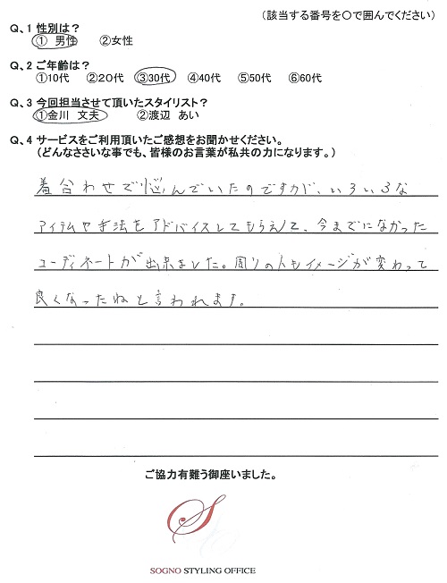 着合わせで悩んでいたのが、いろいろなアイテムや手法をアドバイスしてもらえて、今までなかったコーディネートが出来ました。周りの人も「イメージが変わって良くなったね」と言われます。